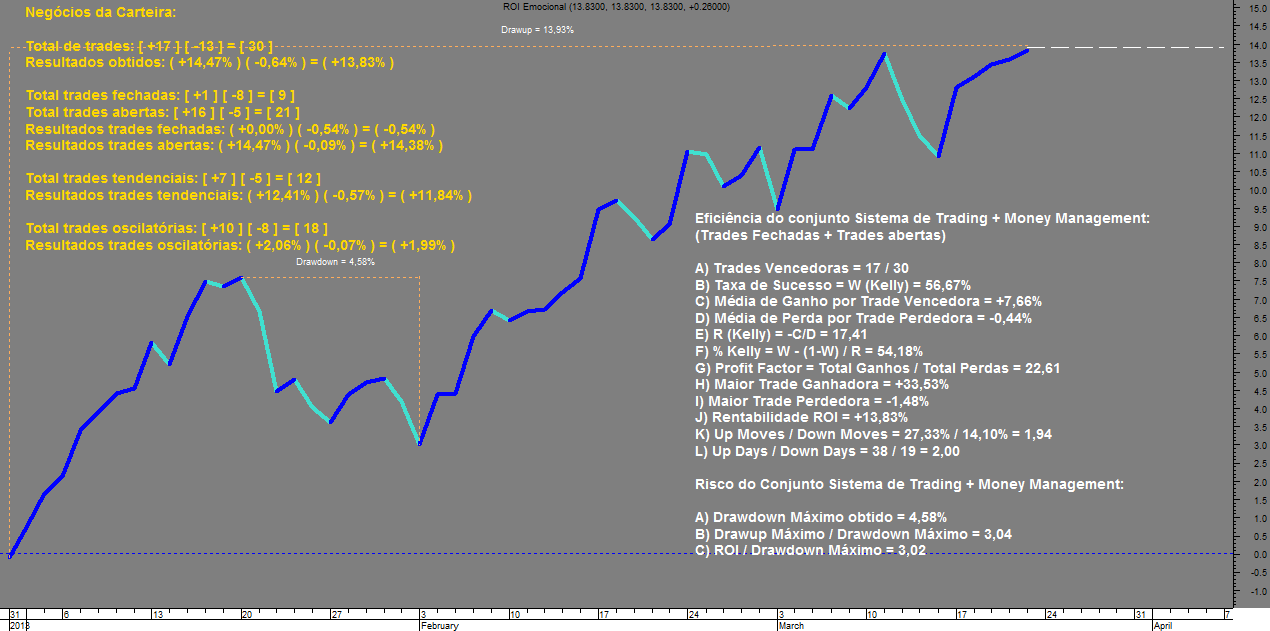 Os restantes rácios significativos estão indicados no gráfico abaixo, devendo-se acrescentar que os resultados obtidos até agora são totalmente irrealistas se os considerarmos projetados no futuro, a rentabilidade está muito acima do que se pode esperar a longo prazo para o mesmo período de trading, bastará constatar que o atual Rácio de Total Acumulado de Ganhos / Total Acumulado de Perdas = 22,61 quando a expetativa a longo prazo não deverá exceder os 2,80.