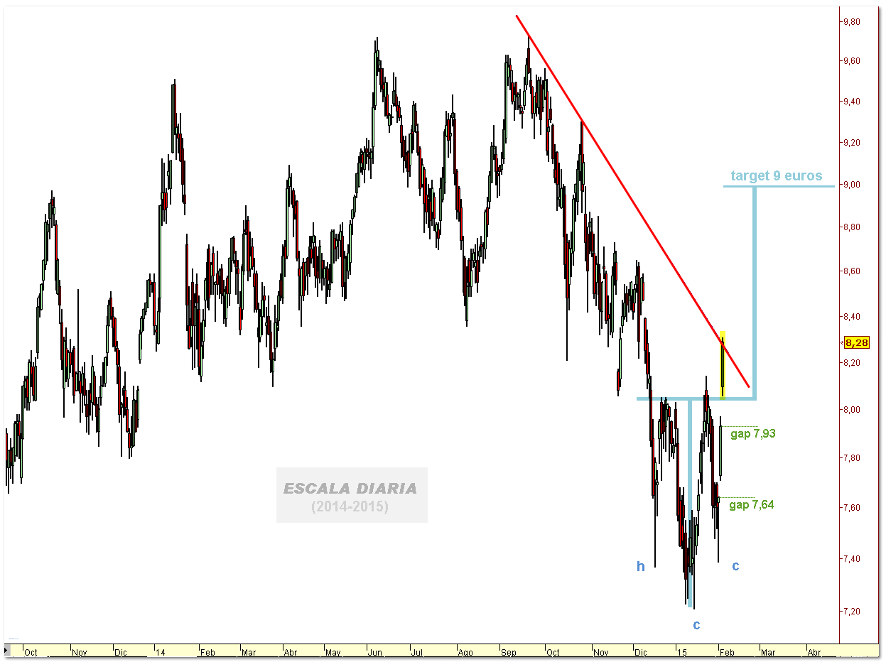 Banco Popular (margem bruta de 9.8%, mais de 330 milhões de RL e mais de 800 milhões de ROF), testou com sucesso os 3.7€ (suporte horizontal) e tem a MM20 à vista (4€). Espere que em breve supere o canal descendente de médio prazo. Entrada como short term trade tendo por objectivo imediato os 4€. Stop loss nos 3.6€