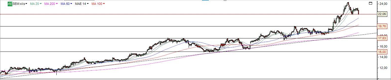 A Altri está potencialmente a formar de facto um duplo topo, caso quebre em baixa o suporte dos 8€. Aí, a projecção leva o preço para próximo do suporte seguinte, os 7€. Após esse, só nos 5.70€. A Altri continua, tal como o resto do sector, em bull mode. Claro que teve subidas fortíssimas e teria que algum dia corrigir. Estou longo na Altri e Semapa, e assim me manterei enquanto os suportes importantes aguentarem.