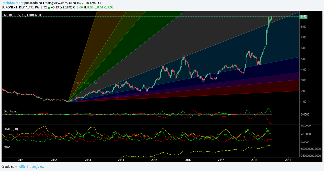 A zona dos 8€ foi confirmada há uns dias como suporte, e abaixo desse valor o preço mantém a acção bullish. E hoje já fez máximos históricos. A isto chama-se bull market, e em bull market deixa-se correr os ganhos, subindo os stop profits. Pelo menos comigo é assim. Veremos até quando dura, pode ser que esta zona dos 8,90€ também seja daqui a uns dias confirmada como o novo suporte, e a escada continue por aí acima.