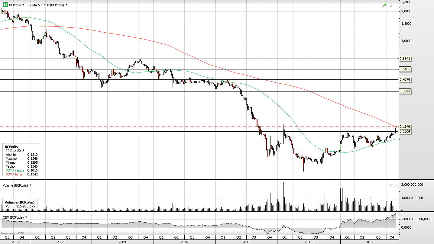 Parece-me evidente que tendo em conta a não existência de resistências relevantes até aos 0,38-0,40, este máximo de 8 de Fevereiro do ano passado na zona dos 0,14, tem que ser levado em conta ainda para mais estando o BCP um pouco esticado.