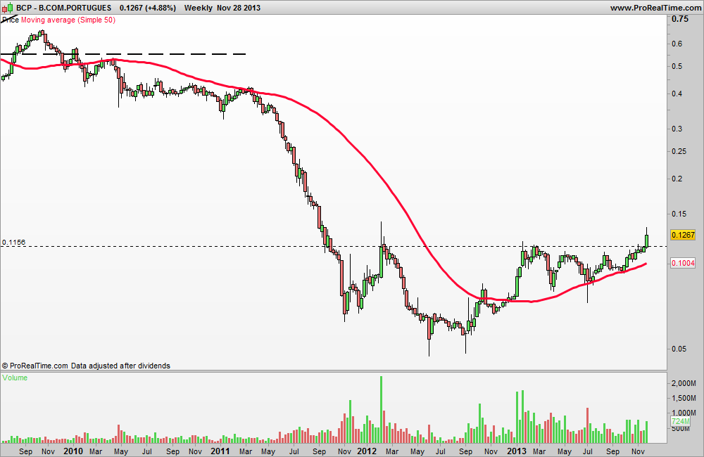 Alguns dirão que já há vários meses que o BCP está em "Bull Market", pois já subiu mais de 100% desde os mínimos. Mas, apesar da violência das subidas, quando isso acontece num período curto podemos estar perante apenas um ressalto violento, algo que já sucedeu no passado. Por isso, centro toda a minha atenção na zona dos 0,12 euros.
