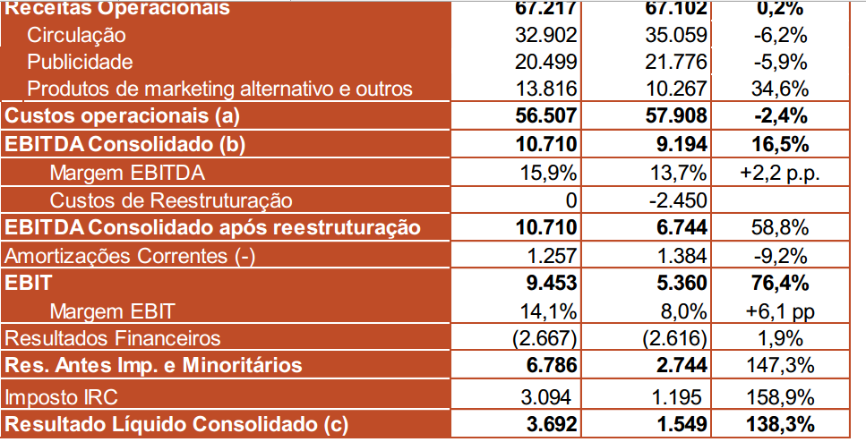 jose antonio 1989 Escreveu:O EBITDA e resultados operacionais da nossa aposta não entra nos resultados da cofina . o resultado liquido da quota parte do investimento na nossa aposta vai entrar nos custos ou proveitos financeiros da cofina . Neste momento o retorno do investimento na nossa aposta é negativo , passou de 200 mil euros registados em 2016 para 23 mil euros atuais . o retorno é negativo . a acção esteve a subir um ano com a conversa que jogo da nossa aposta is ser uma mina . até agora o que vê são retornos negativos . mesmo que no futuro melhorem não deverão ter uma grande dimensão nos resultados correntes da cofina . Se resultados melhorarem terá de vir da atividade tradicional que normalmente tem os resultados estagnados ao longo dos anos e não do jogo . Nos próximos trimestres iremos vendo a evolução do investimento na nossa aposta que para já se mantem negativo .
