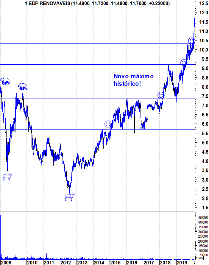 Deixo os gráficos actualizados da EDPR. Para quem duvida do poder de um "Bull Market", este é um belo exemplo. 7 anos e meio de subidas, durante o caminho muitos saíram dizendo que já tinha subido demais. Recordo uma bela discussão aqui no Caldeirão em 2018, quando a EDPR estabeleceu um novo máximo histórico e houve logo quem dissesse que era preciso cuidado, sendo que os homens da análise técnica apressaram-se a dizer que um máximo histórico é o mais poderoso sinal de força e de compra que existe.