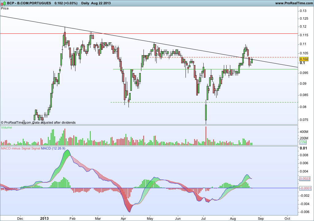 Se nos focarmos no curto/médio prazo, a linha de tendência que vinha a acompanhar a descida desde o início do ano foi recentemente quebrada em alta com algum volume. Mas a inactivação do padrão de lower-highs que vinha a desenhar-se (ainda por cima com alto volume) deixou-me um pouco de pé atrás. Actualmente, e apesar dos sinais interessantes, uma nova queda até à zona dos 8 cêntimos não pode ser descartada.