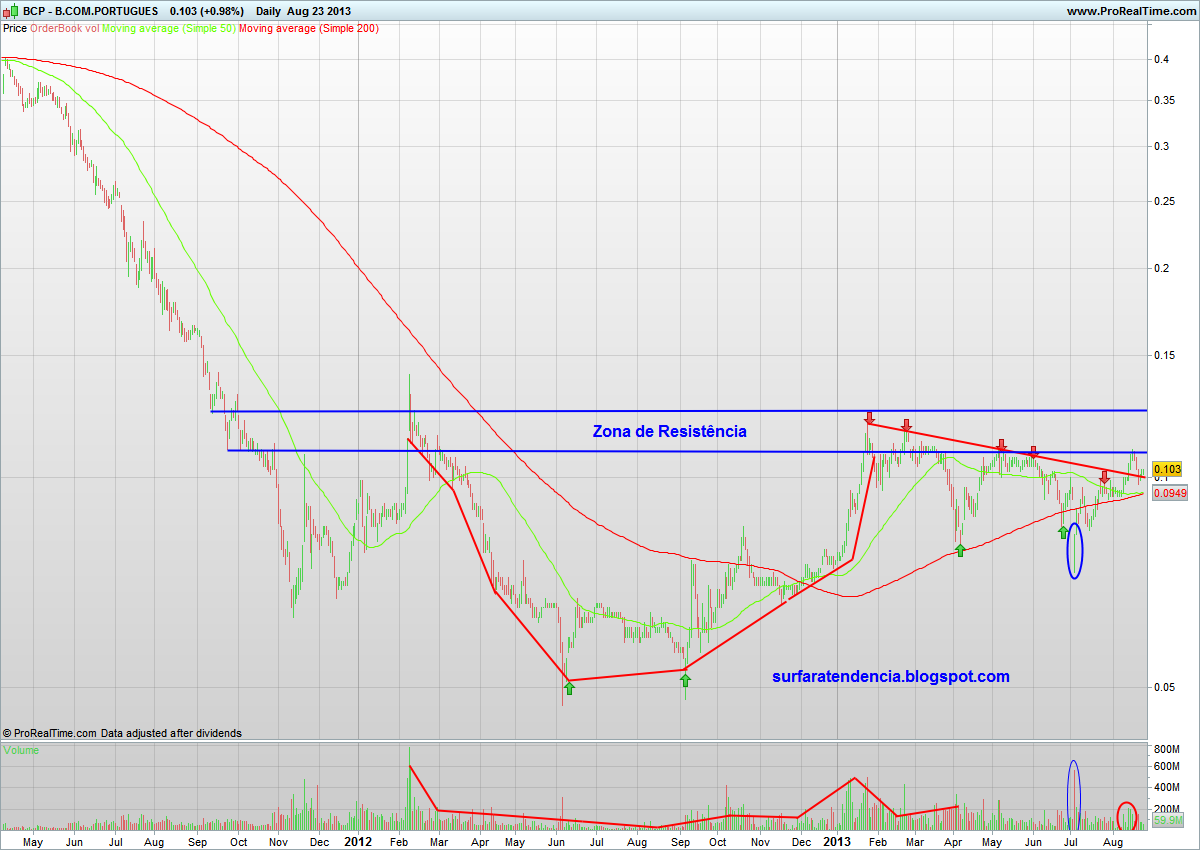 Indo à técnica, os sinais de compra efectiva para um horizonte de longo prazo ainda não surgiram. Nos últimos meses pensei que iamos assistir a um fundo em U. Gorada essa possibilidade após o impacto com a zona de resistência ponderei a activação de um massivo cup & handle. O que é facto é que esta teimosa zona de resistência (construída tendo por base uma quebra de 57% em pouco mais de 3 meses) tem impedido a activação de qualquer padrão de inversão.