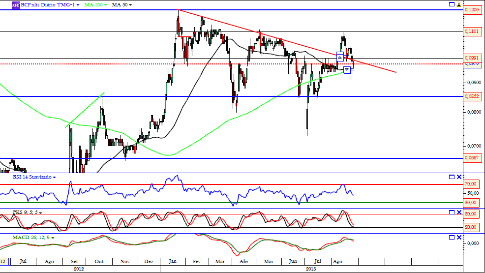 Pessoalmente entraria no BCP se a zona de resistência fosse quebrada em alta de forma efectiva e se a minha teoria quanto à inversão de médio prazo no mercado português não se chegar a verificar. Uma entrada neste momento não seria, de todo, prudente. Uma entrada após a eventual quebra em alta da zona de resistência será muito mais prudente e não menos lucrativa, já que existe uma subida potencial de 180% até à próxima resistência! Irrealista? Talvez, mas os mercados são imprevisíveis....