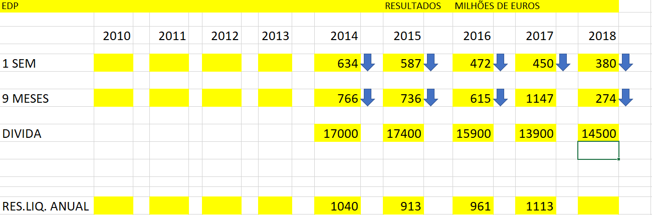 Os resultados caíram a pique devido a fatores correntes , taxas energéticas e em parte por um fator que se presume extraordinário , mas a divida aumentou de 13900 milhões de euros em 2017 para 14500 milhões de euros em 9 meses de 2018.