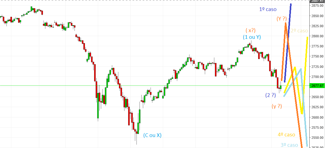 Esse caso a laranja é para mim o mais provavel neste momento com um topo acima dos 2789.15 mas abaixo dos maximos, voltando para quebrar em baixa os 2532, antes de voltar ao Bull, nem que seja por muito pouco.