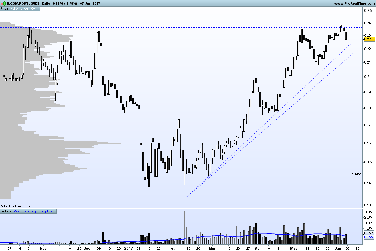 O BCP mantém-se no caminho e a tendência é clara. A menos que fure em baixa a linha ascendente de médio prazo, em Agosto deixará a casa dos vinte cêntimos.