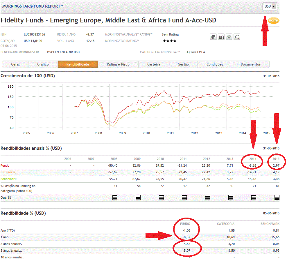 Em relação ao Fidelity EMEA, tens a noção, que os retornos do fundo em EUR é influenciado pelo EURUSD? Porque o fundo originalmente é USD. Senão vejamos a versão deste fundo, na sua moeda original, o USD, e com os retornos sem estarem convertidos para o EUR. Repara que é a classe A do fundo, a classe com melhores desempenhos em relação á classe E, devido ás comissões.