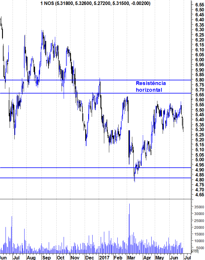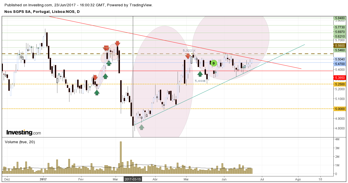 RFPB, as análises que aqui deixo são de médio e longo prazo e, para mim, nesse horizonte temporal a zona entre os 5,65 e 5,80 é a decisiva. Por um lado, porque em 2017 a Nos não conseguiu superar essa zona. Depois porque foi a zona que suportou a acção em Fevereiro, Março, Abril, Agosto e Outubro de 2016. Por isso, para mim, é uma zona de enorme importância.