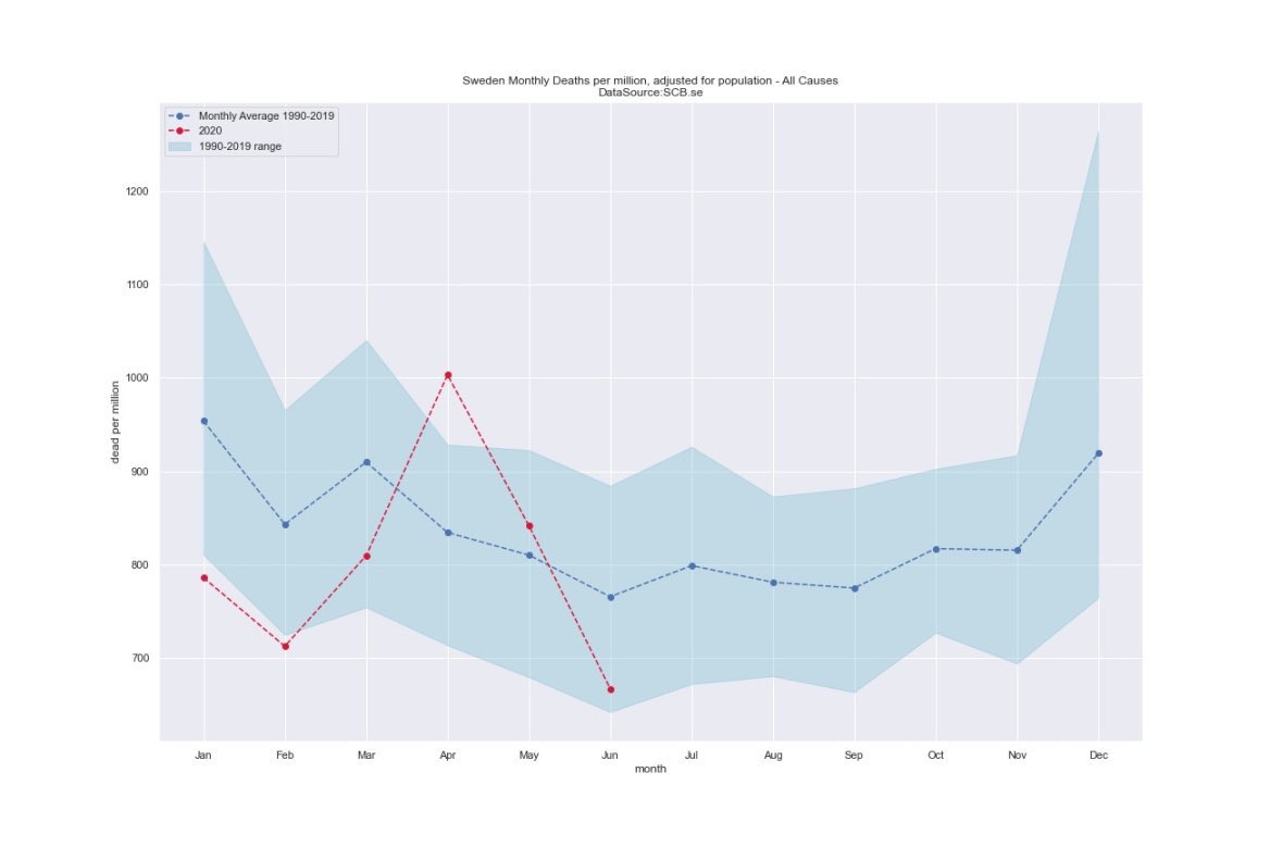 Nota : Se a noticia abaixo estiver correta quando à mortalidade da Suécia de Janeiro a Junho de 2020, diferente do yggy, se o desvio de 2015/2019 dele estiver bem, isto é pelos 45.869,40, o desvio em junho seria superior na Suécia , isto é pelos 12,068%.