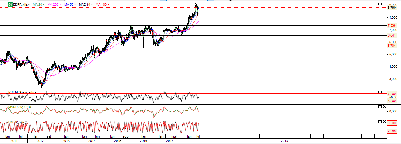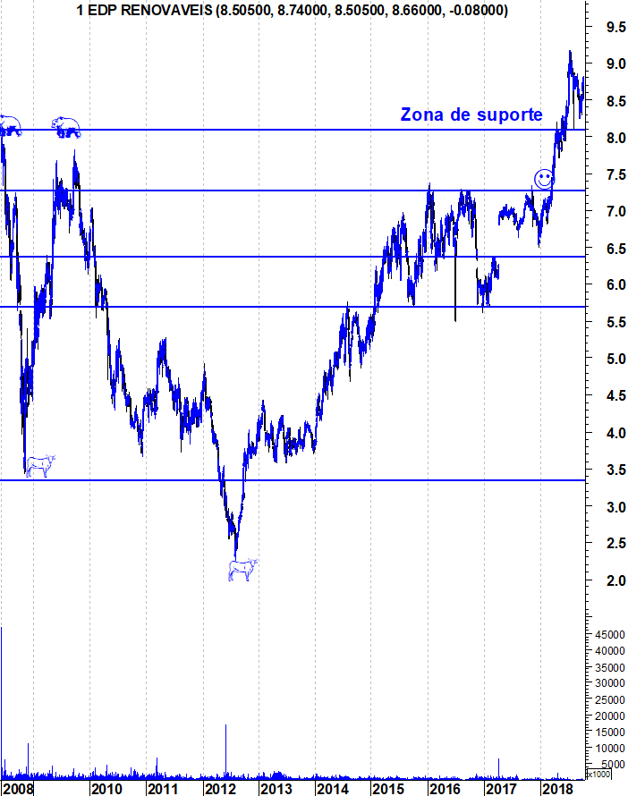 A EDP Renováveis continua um dos mais longos "Bull Markets" em curso na Bolsa portuguesa. São já 6 anos e meio de domínio dos touros e, enquanto o suporte na zona dos 7,3 euros não for quebrado, os touros continuam no controlo da acção em termos de longo prazo. 6 anos e meio de "Bull Market" de uma acção que mais que triplicou o seu valor.
