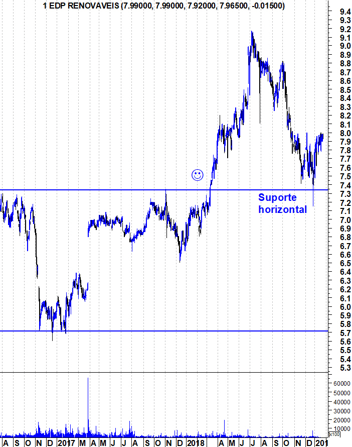 O outro motivo menos óbvio foi o comportamento da Renováveis nesta correcção dos últimos meses. Em 50 sessões desde que começou a corrigir, a acção fez apenas 13 velas negras, ou seja, em que o fecho foi inferior à abertura. Apenas 26% de velas negras numa acção que corrigiu nesse período é um claro sinal de força da acção.