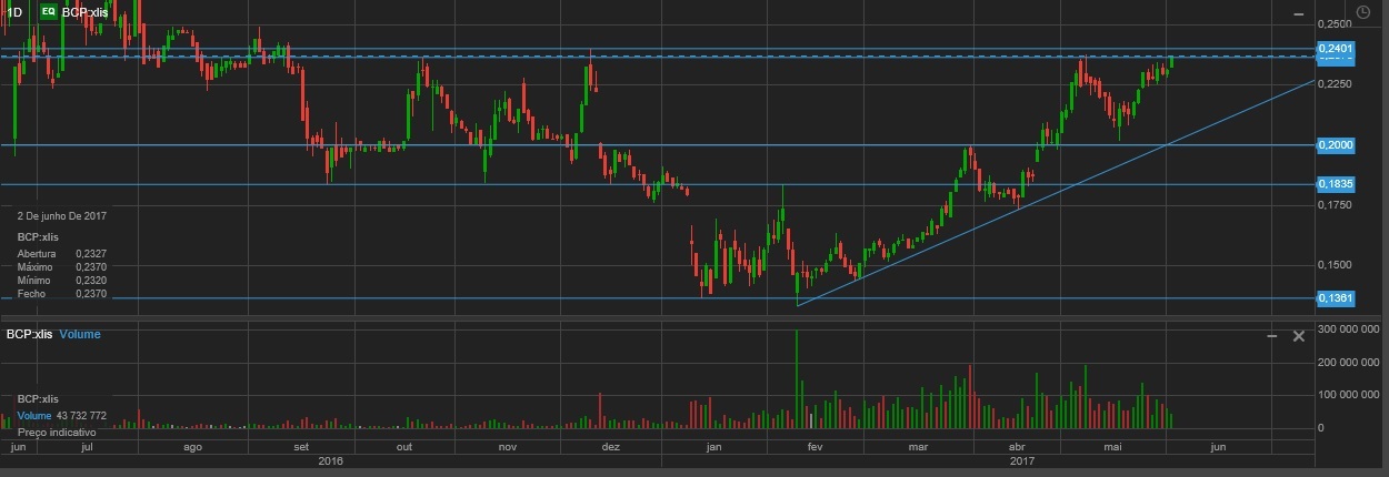 o BCP está a mostrar alguma força, mas com a abordagem que construiu ao chegar `a área 0.24€, deveria ter um impacto " forte" e sem duvidas.