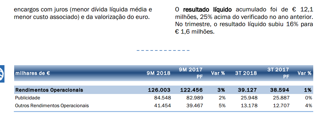 NO 3º TRI de 2018 a IMPRESA teve de resultados líquidos PREJUIZOS de 1 MILHÃO euros , que basicamente COMERAM METADE dos resultados que tinha tido no 1ª SEM e passou de um resultado no 1º SEM de 2.5 MILHÕES para 1.4 MILHôES nos 9 MESES .