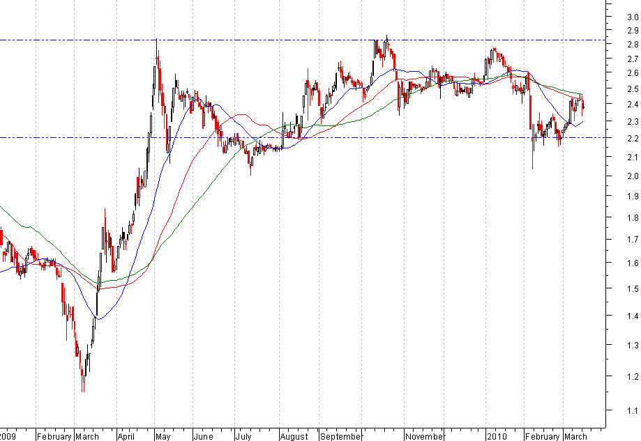 No passado dia 6/Abril, ao quebrar em alta a sua resistência dos € 2,45, a cotação reactivou o seu antigo canal de lateralização entre os € 2,45 e os € 2,84, entrando assim numa área com poucas resistências importantes, o que pode se traduzir em caminho aberto para novos rebounds.