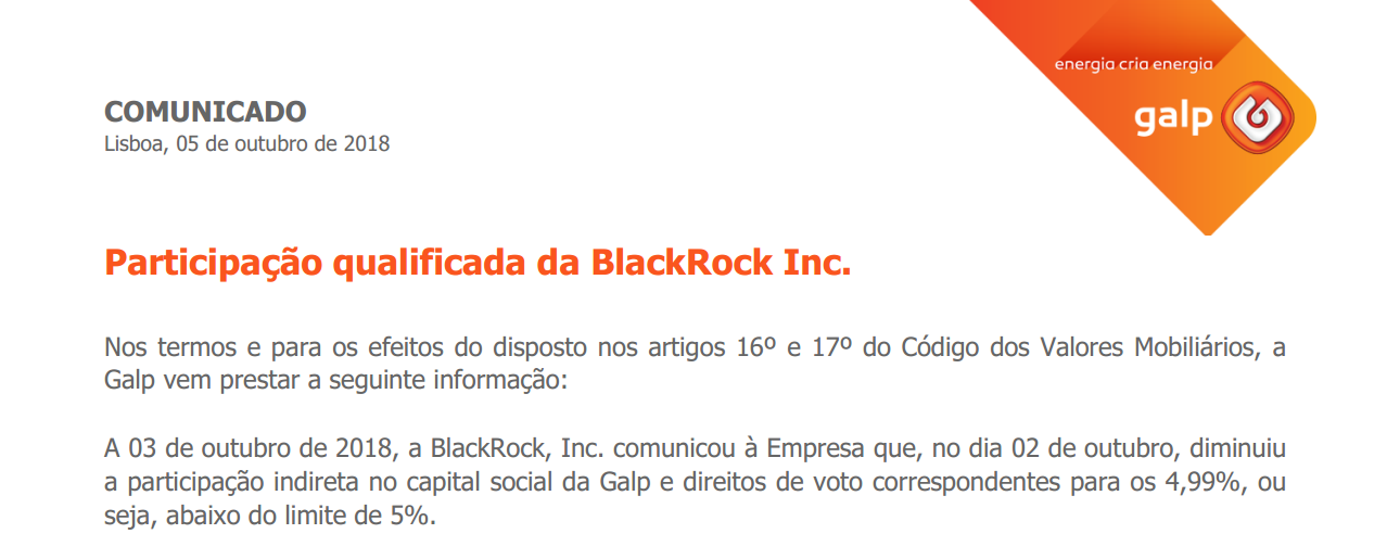 A BLACKROCK baixou a posição na GALP ABAIXO dos 5% para 4.99% .