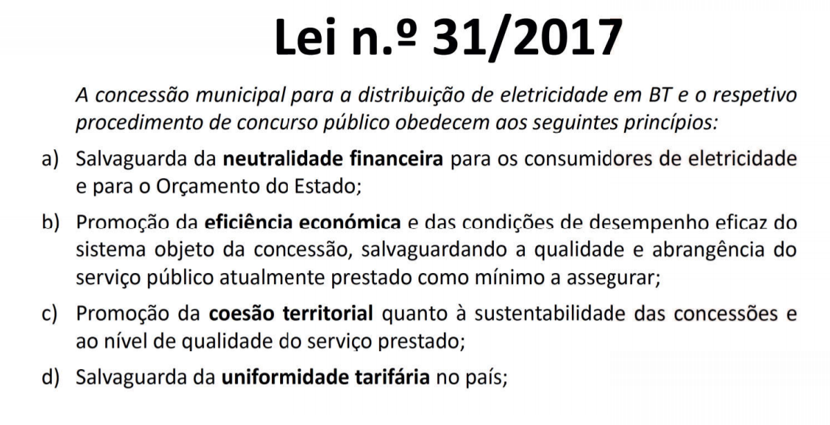 2. Dispõe a Lei n.º 31/2017 que a concessão municipal para a distribuição da electricidade em BT e o respectivo procedimento concursal tem de salvaguardar a neutralidade financeira para os consumidores e para o Estado, isto é, não pode onerar a fatura da luz nem os encargos do OE.