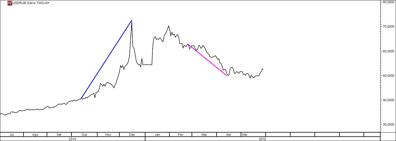 Quanto ao rublo, abaixo vou postar um gráfico do rácio USD/RUB, no qual é visível a brutal valorização do RUB face ao USD, em cerca de 30%, no período de 1 de fevereiro a 18 de maio de 2015. Achas que aqui não há dedo do Banco Central russo e do diretório do Putin? É que se tu achas que tal valorização do RUB face ao USD foi exclusivamente obra dos ditos mercados, sem os russos estarem envolvidos, então não vale a pena continuar a partir pedra sobre o assunto, pois nesse caso tu ficas com a pedra preciosa rubi e eu fico com a esmeralda.