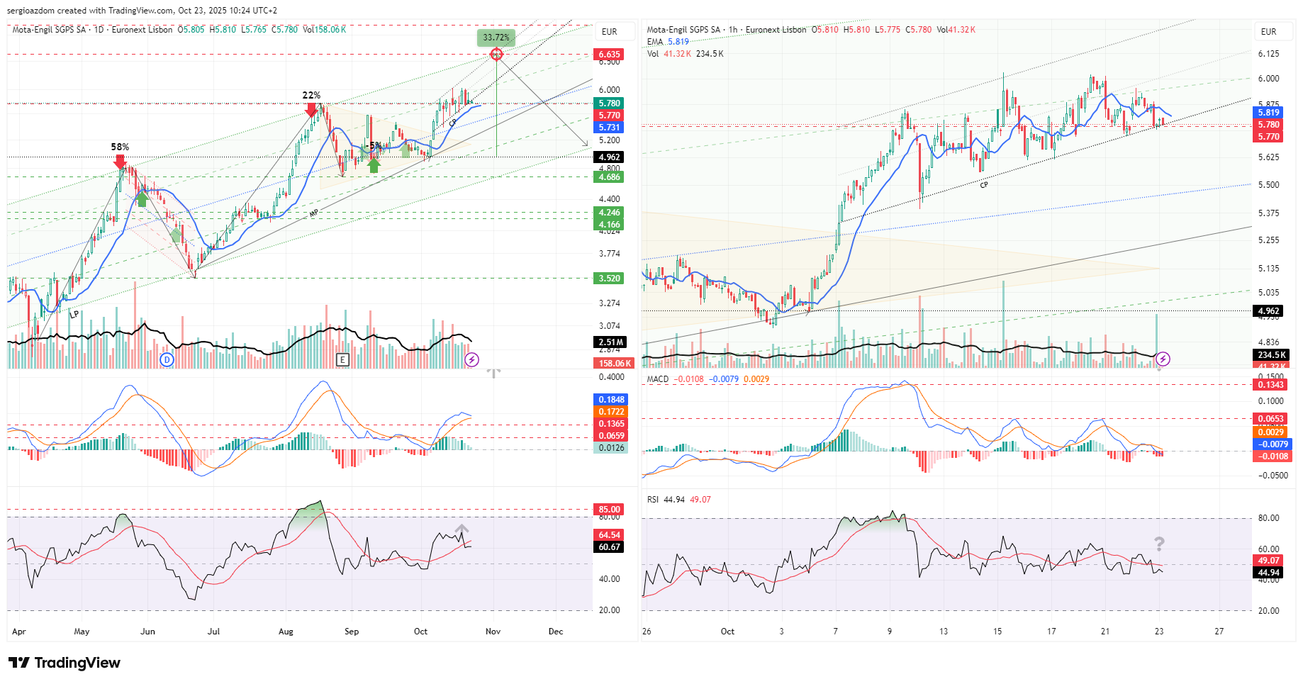 MACD e RSI semanal parecem apontar para subida sustentada, ao passo que no curto prazo parecem estar a perder força.