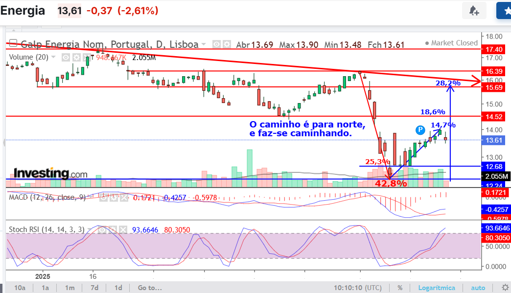 Depois de ter quase chegado aos 64, respirou e formou um ombro direito de IHS. A projeção, quando os 64 forem ultrapassados, aponta para ... 72. E a Galp irá atrás. São quase 15% em ambos.