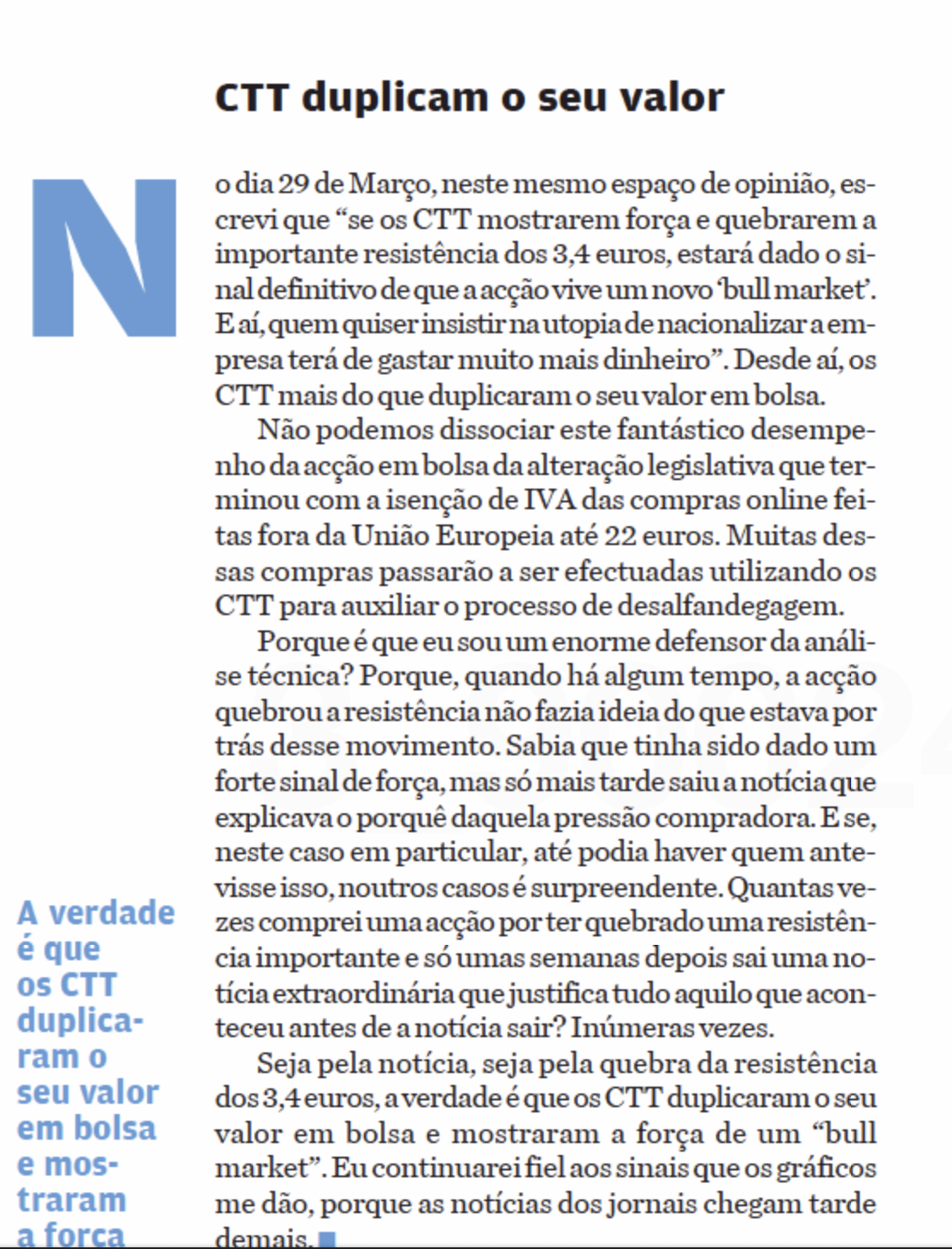 Nunca te ouvi a defender telecoms, pelo contrário, mas ouvi-te dizer que os ctt seguiriam o caminho da PT, ou seja pelo cano abaixo.