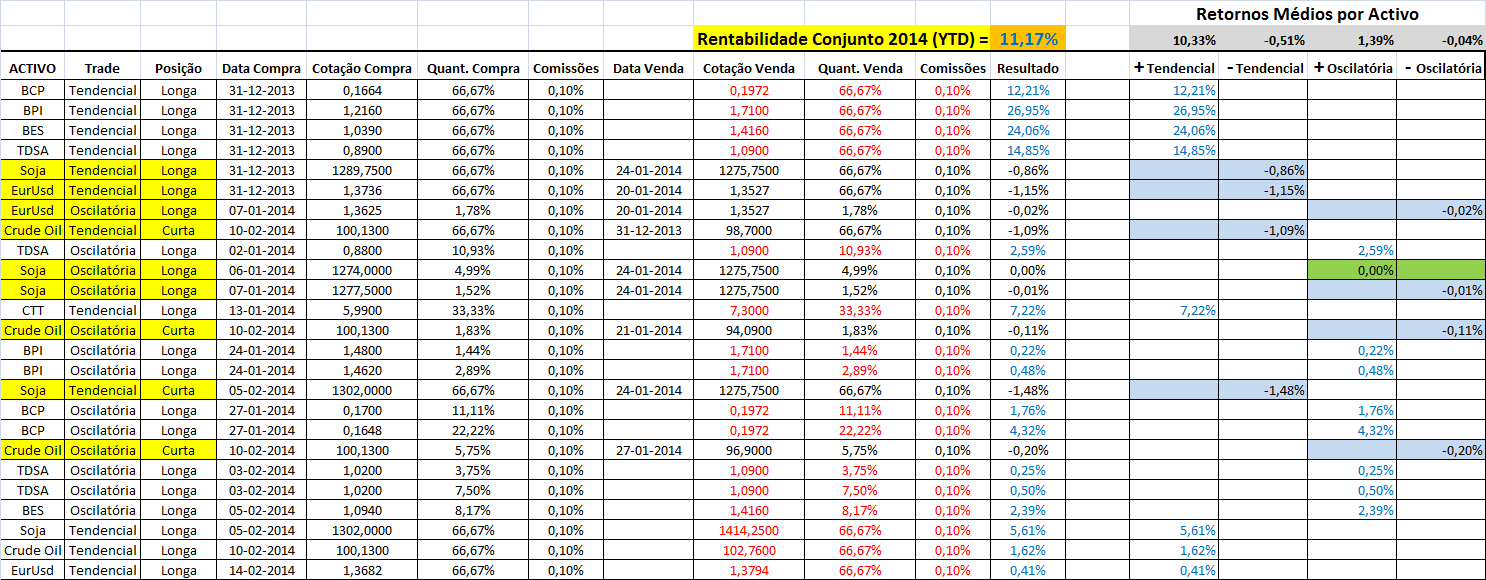 Dos negócios tendenciais fecharam-se 4, todos eles a registar prejuízos e com o mais negativo a marcar -1,48% do capital total atribuído à Soja. No entanto as restantes 8 trades ainda em aberto contêm o núcleo essencial dos lucros da carteira, em que o negócio mais proveitoso de 2014 tem sido até agora o BPI com uma rentabilidade de 26,95% do capital total (tendencial + oscilatório) reservado para a ação.