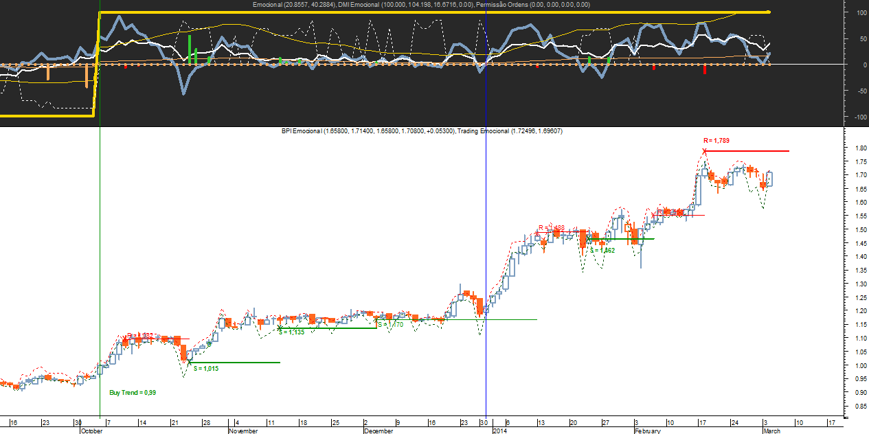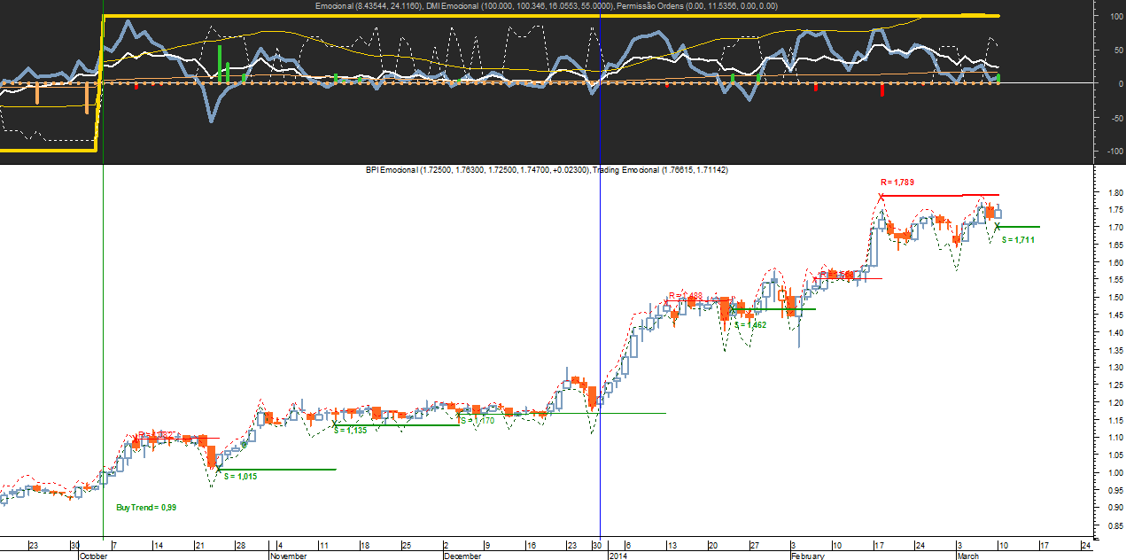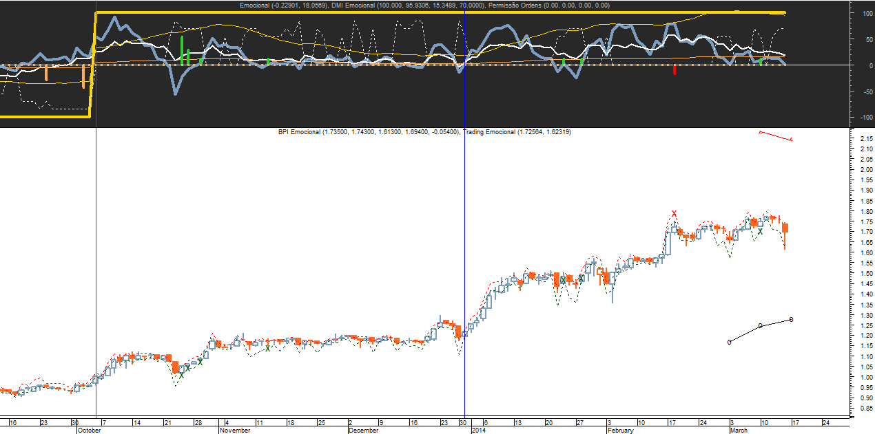 Também no gráfico dos indicadores de cima podem observar um detalhe que anteriormente ainda não referi: existe uma linha amarelada de traço fino que continua a subir. Isto significa que as cotações se estão a desenvolver num contexto de volatilidade crescente. Se os valores das cotações continuam num movimento ascendente e este movimento é acompanhado por um clima de volatilidade crescente eu daria o conselho de preferencialmente evitarem vendas neste contexto, porque são as melhores alturas de acumulação de lucros na carteira e estes cenários ocorrem somente em menos de 25% do tempo em que o papel se encontra cotado em Bolsa. No caso particular do BPI podem apreciar que este fenómeno se iniciou sensivelmente desde o início do ano para cá, a partir da linha azul vertical do gráfico, numa altura em que o BPI cotava nos 1,187, tendo portanto subido cerca de 44% em cerca de 2 meses neste clima ultra-favorável.