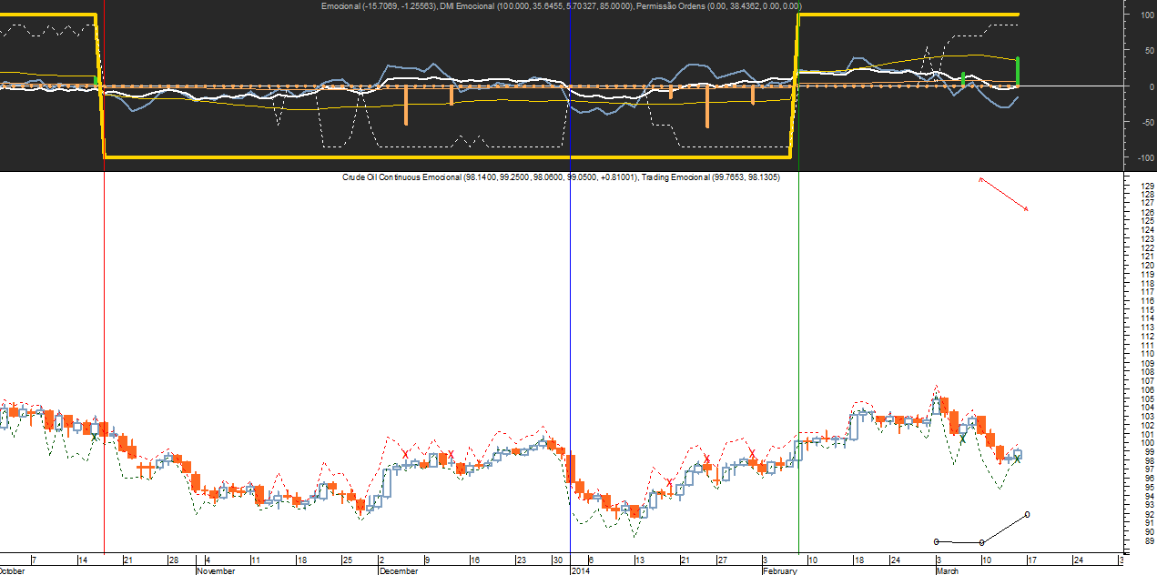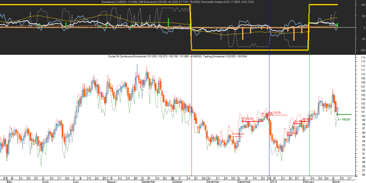 Enquanto as ações da Bolsa portuguesa da carteira “Emocional 2014” continuam a evoluir sem que haja para já qualquer rasto de sinais de compras e vendas, sejam elas em regime tendencial ou oscilatório apesar de termos alguns papéis bastante quentes que deixam adivinhar a curto prazo o eventual aparecimento de algumas vendas para realização de mais-valias na componente cíclica dos “swings”, na parte da carteira correspondente às “commodities” registou-se para amanhã no Petróleo um sinal de reforço de compras na componente oscilatória.