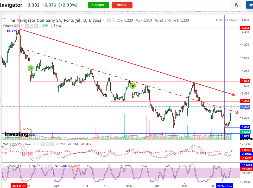 Resultados maus, reação péssima. Agora sobrevenda grande, muito abaixo das Bollingers no diário, sobre a Bollinger inferior semanal. Grande gap aberto, felizmente suporte dos 3.00 não quebrou, em princípio será um suporte forte. Vamos ver se o acordo das tarifas acalmam a procura e se o dólar recupera um pouco. Mas confesso-me decepcionado pelos resultados semestrais