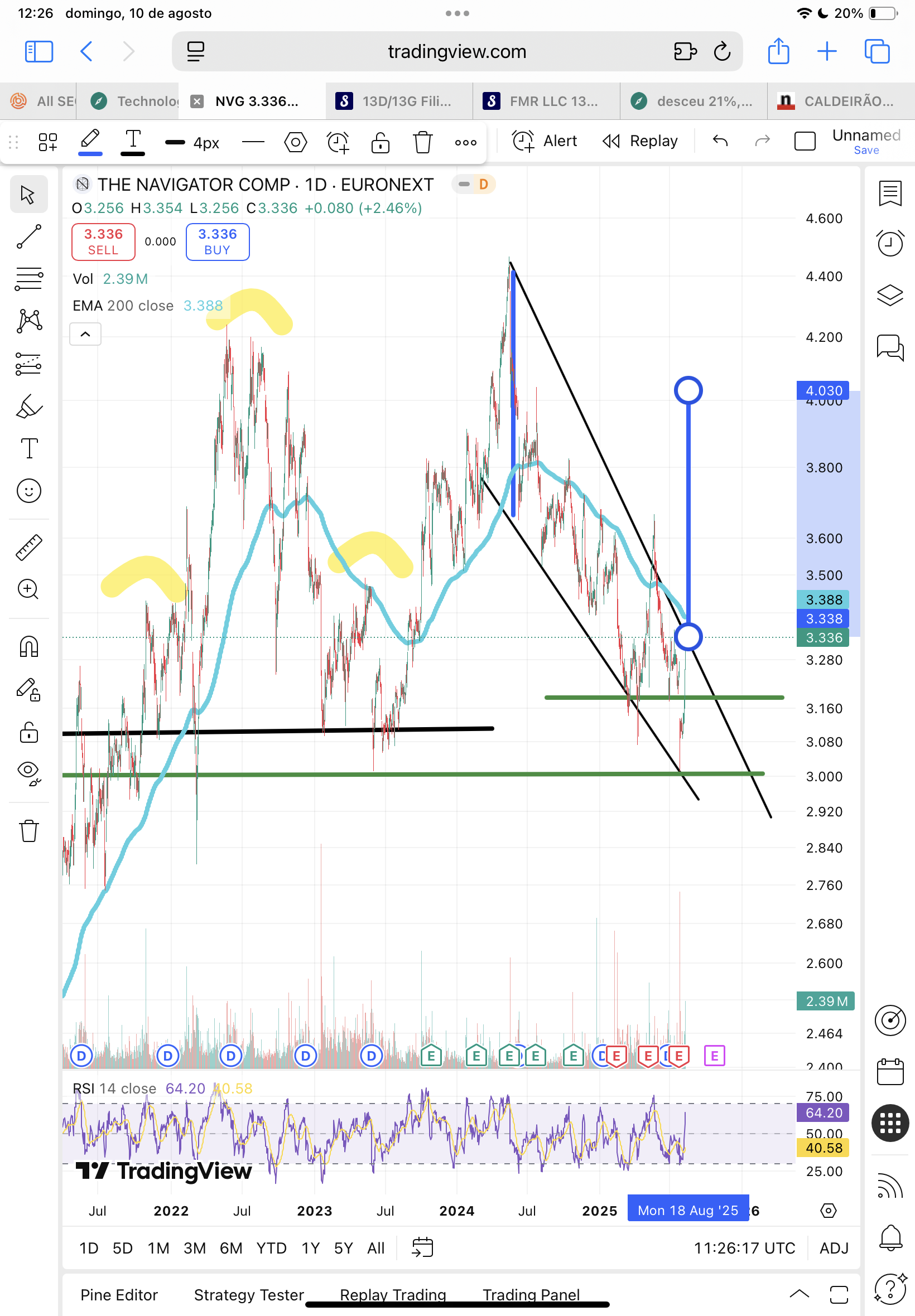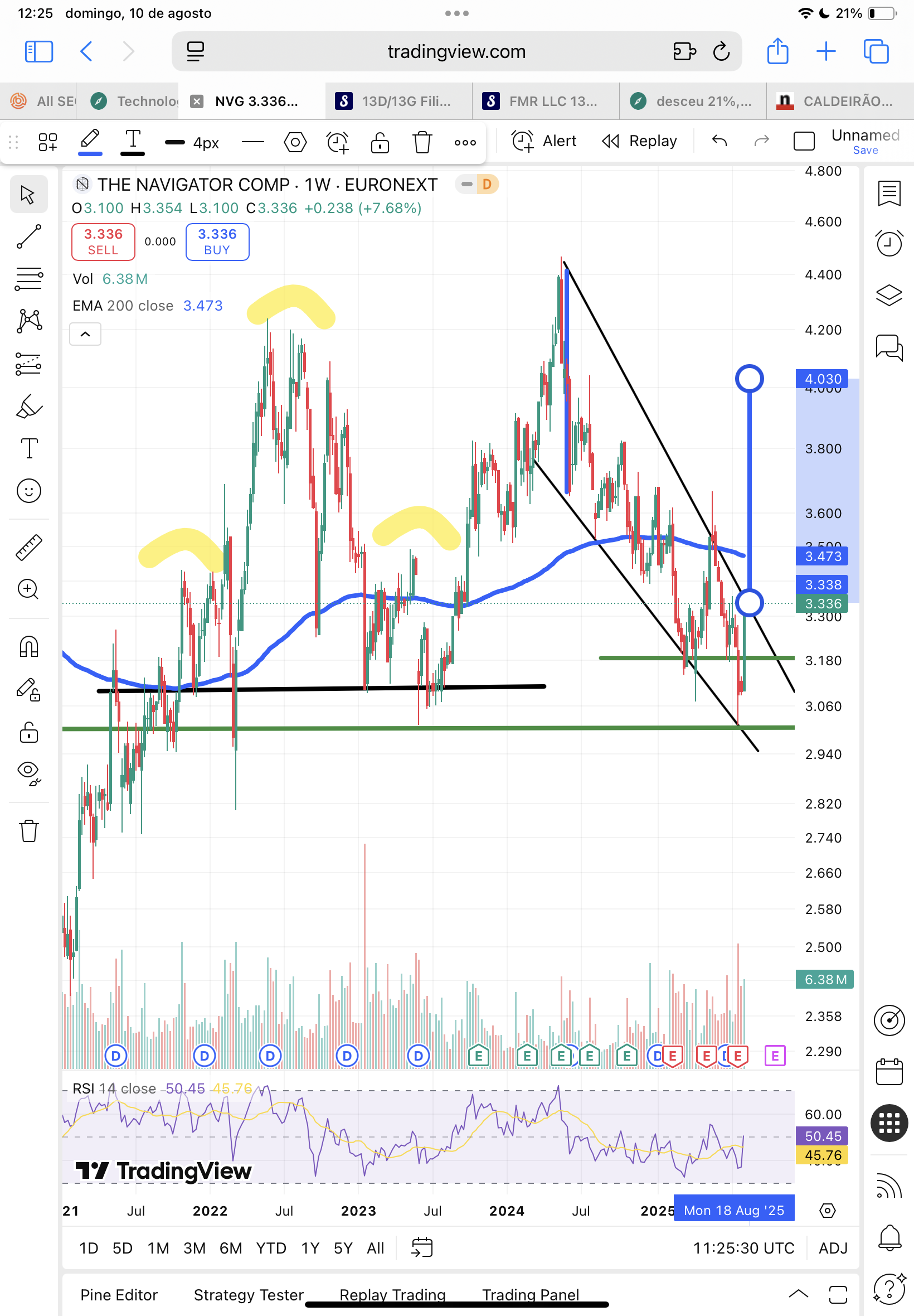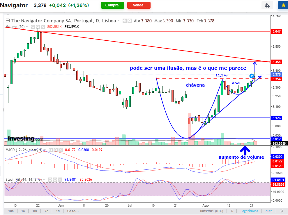 a falling wedge, se o preço vencer os €3,36, com volume, talvez ataque a próxima zona de resistência dos €3,60, €3,80.