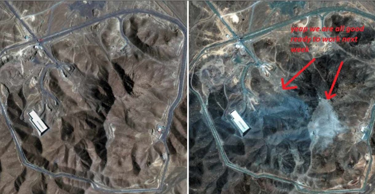 Não faço a mínima ideia do que disse o Sócrates, a Catarina , a Cia e a Mosad, nem se as Instalações foram completa ou parcialmente destruídas, Não me referi a nada disso, apenas à tua afirmação de que "Literalmente demoliram parte da montanha..." acompanhado por imagem do antes e depois que mostra todos os montes e relevos intactos, apenas cobertos de cinza. podem por dentro estar feitas em cacos, à superfície, nessas imagens, estão intactos. Há outras imagens em que pelo menos se vêm os buracos da perfuração das bombas, nesses não se vê absolutamente nada além de terra queimada.