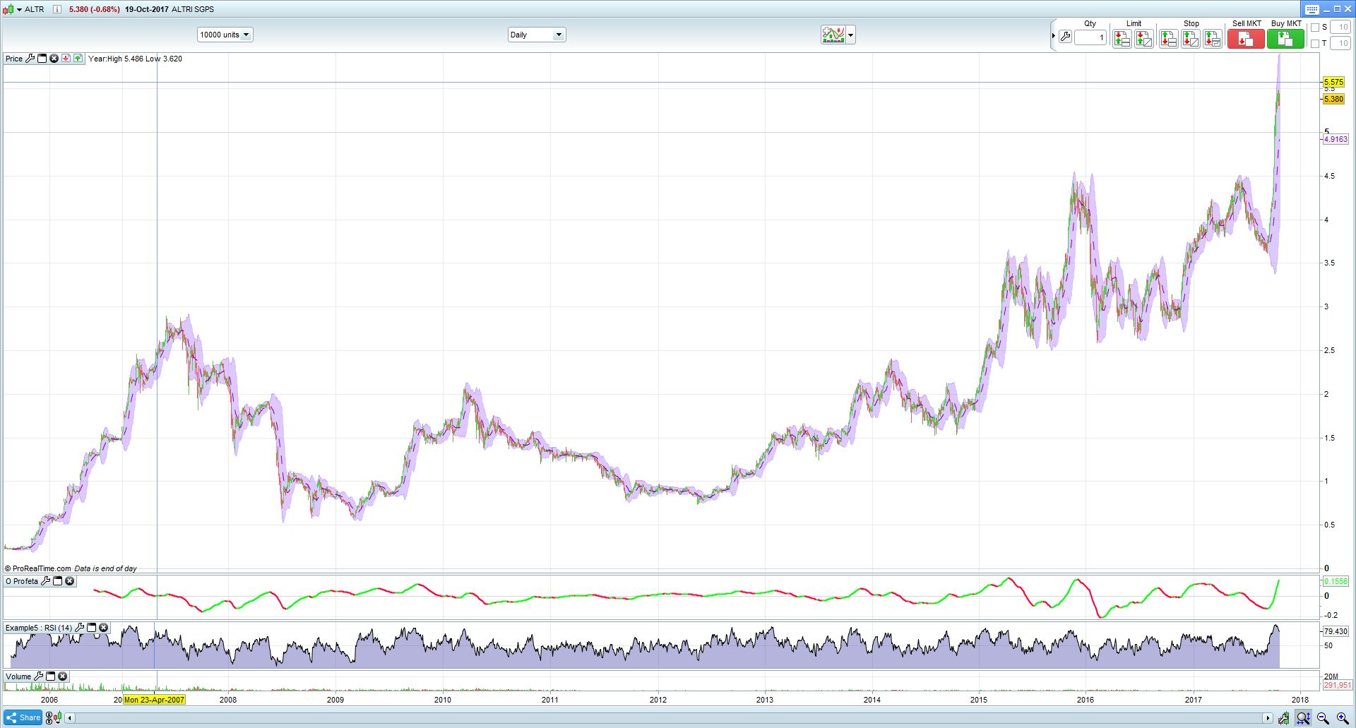 O gráfico que tenho do ProRealTime não bate certo com os que já vi por aqui ... pelo meu ProRealTime o máximo histórico teria sido a Novembro 2015 por volta dos 4,40€, valor testado em ínicio de Junho 2017 e quebrado de vez no final de Setembro / iniico de Outubro. Não esperava esta subida tanto tempo seguido sem respirar.