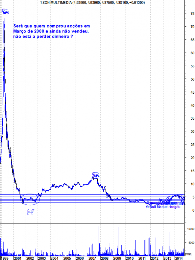 Ulisses Pereira Escreveu:johny, a minha resposta está muito em linha com a do ricardmag. Ou seja, a quebra do suporte entre os 6,85 e os 7 euros fez-me despir o meu fato de touro mas eu não visto imediatamente o de urso. Caso a Nos quebre consistentemente a zona de suporte entre os 5,7 e os 5,8 euros, então aí vestirei o meu fato de urso.