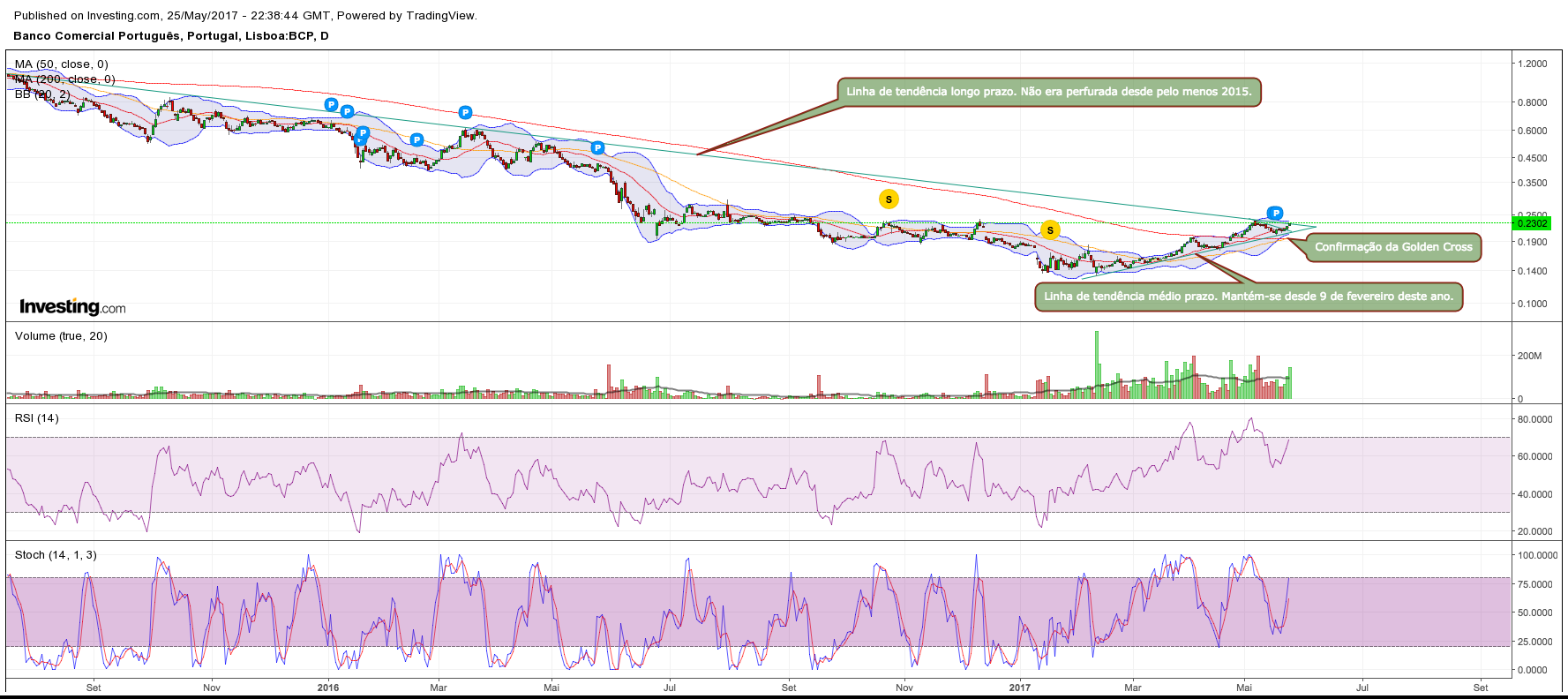 Irrelevante para uns e mais importante para outros é a Golden Cross. Ou melhor a "rainha" das Golden Crosses. Ou por outras palavras, o cruzamento das médias móveis das últimas 200 sessões pela das últimas 50. É um evento raro - sucede raramente - não só porque a linha das 200 semanas é uma linha lenta que tende a demorar muito a responder a alterações bruscas da cotação, mas que por outro lado nos dá informação muito relevante que nos mostra uma tendência mais segura e a sua confirmação de forma mais segura que muitos outros instrumentos de análise técnica. De facto, embora a análise técnica tenha como base a análise de dados do passado, mostra-nos uma tendência, aponta-nos um caminho, mais ou menos provável com base na tendência passada. E o que nos mostra o passado é que para o BCP a Golden Cross (das 50x200) tem sido, na sua maior parte das vezes, um sinal que poderá antecipar um upside da cotação. Para melhor compreender basta ver o histórico recente da cotada e analisar o que sucedeu à cotação do BCP depois deste evento.