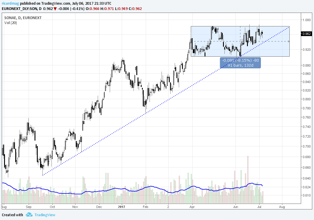 O gráfico da Sonae continua a ter um belíssimo aspecto no médio/longo prazo e o seu "Bull Market" continua intocável. E isso são boas notícias para o PSI dada a elevada correlação entre ambos.