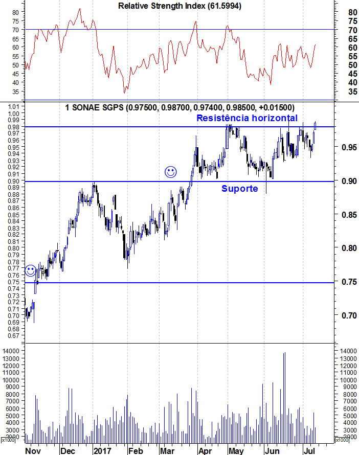 Dito isto, mantenho o meu optimismo em relação à Sonae SGPS. Se ela estivesse num "Bear Market" talvez reforçasse o que o Eagle disse de termos cuidado porque ainda não quebrou a resistência. Mas ela vive um "Bull Market" há 1 ano e, por isso, não vejo qualquer sinal de fraqueza num dos gráficos mais bonitos da nossa Bolsa. E num dos gráficos mais importantes porque a sua ligação umbilical ao PSI é mais do que conhecida.