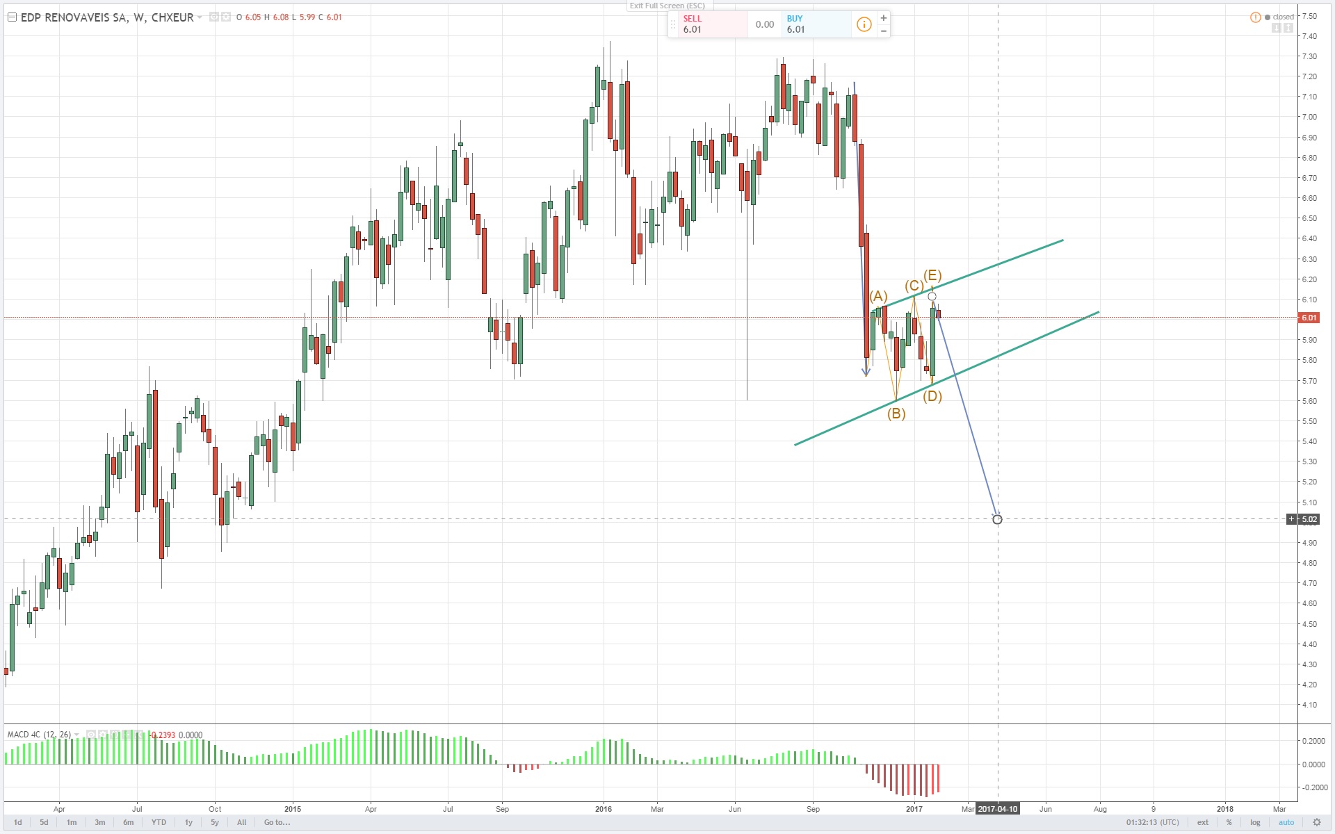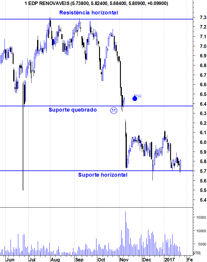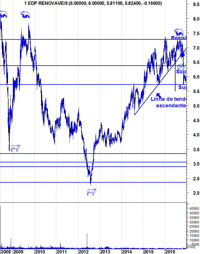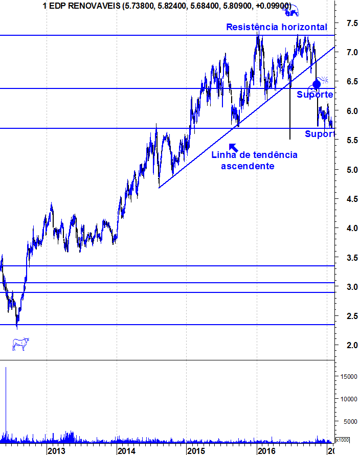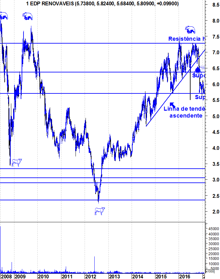 A edp r ainda nao perdeu o seu bull market,na minha opiniao fechos semanais abaixo dos 5.60 aproximadamente,activaria um padrao feio e consequentemente ficaria bear.