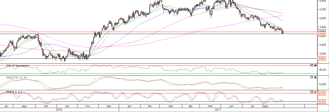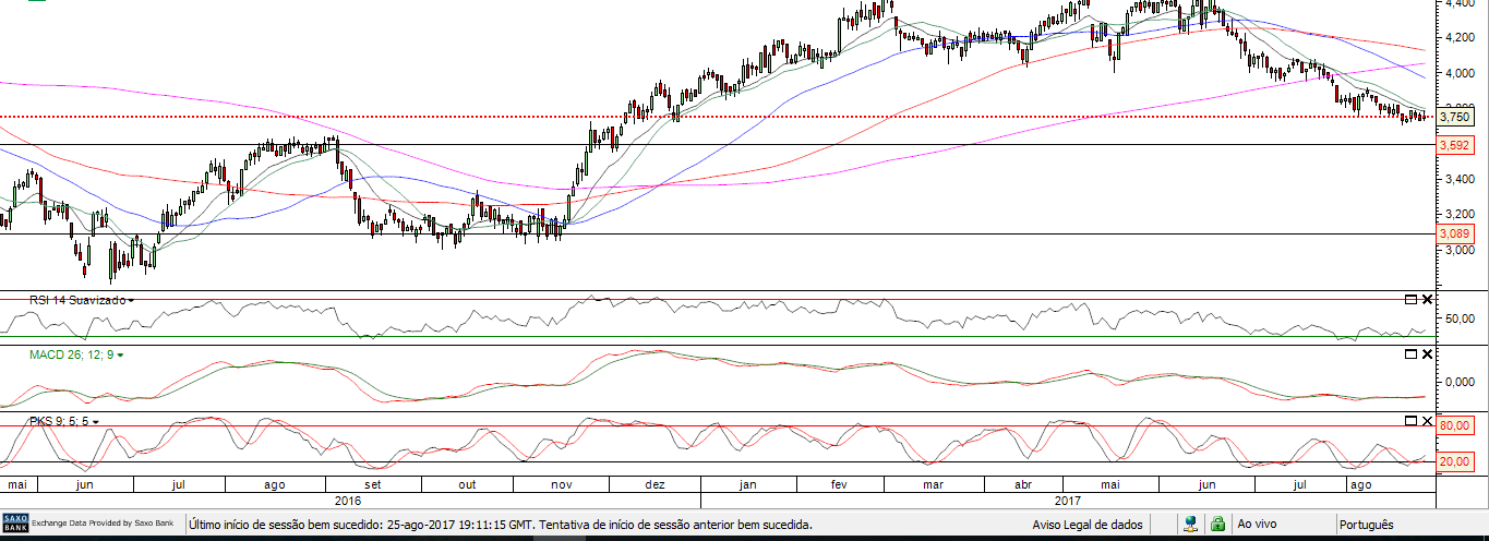 Olhando para o gráfico desta cotada e a configuração do mesmo , observo que no diário, vai até perto de algumas MM mas não tem força para subir acima desse nível, mantendo-se abaixo de todas as MM, revelando enorme fraqueza do titulo e mantendo o sentido descendente , estabilizando nestes 3 dias em que mercado esteve á espera de Jackson HOLE .