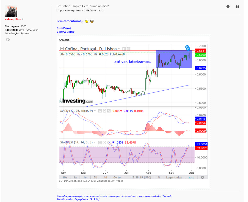 Mantém-se firme e, quanto a mim, pode disparar a qualquer momento. Continuo muito confiante nesta cotada porque tecnicamente está num bullmarket irrepreensível. Quebrando em alta esta barreira dos 0,67-0,68 pode chegar a patamares muito mais altos.