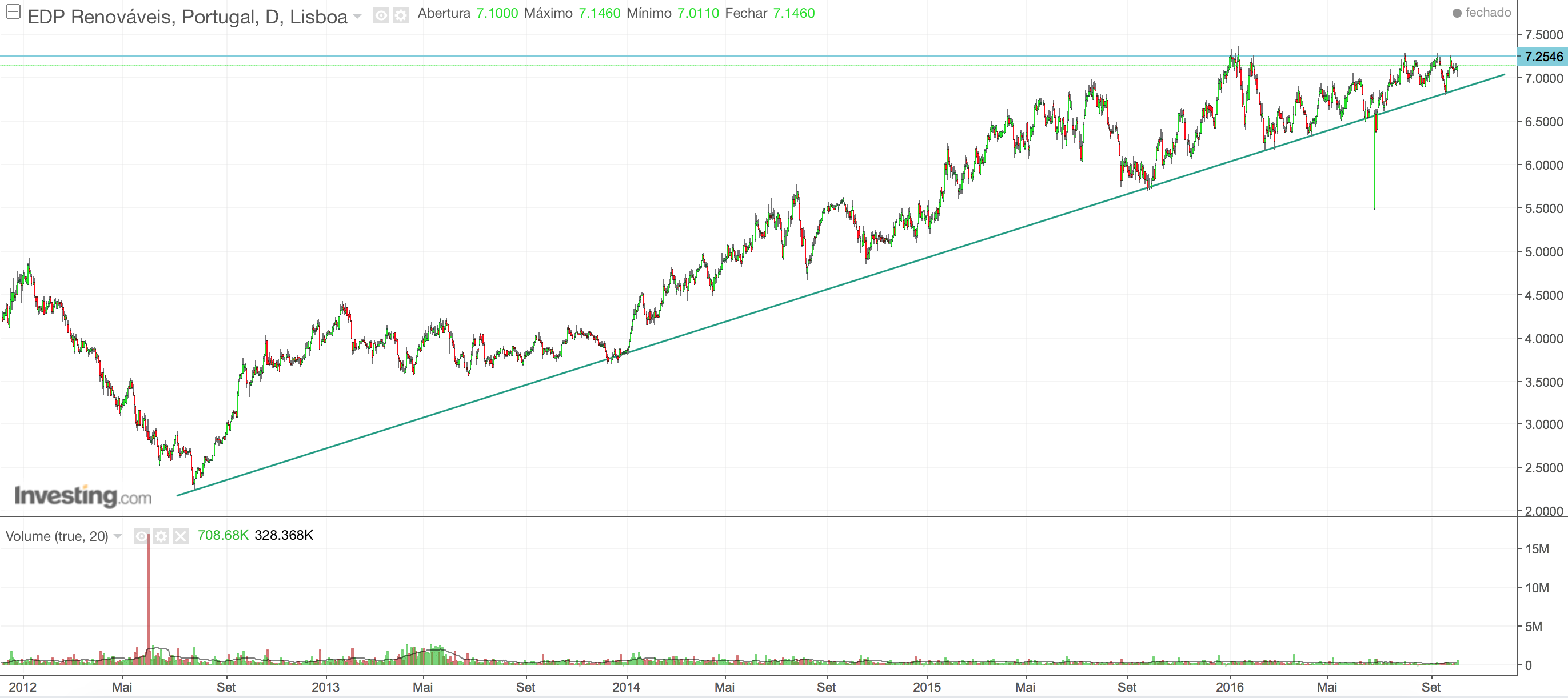 Não sei se será esta próxima semana, ou um pouco mais tarde, mas o certo é que a EDP Renováveis continua o seu maravilhoso Bull Market sem sinais de fraqueza ainda e tudo parece indicar que teremos um disparo para cima brevemente. Se eu quisesse entrar na acção, apesar do optimismo, esperaria então uma quebra em alta dos 7,30€.