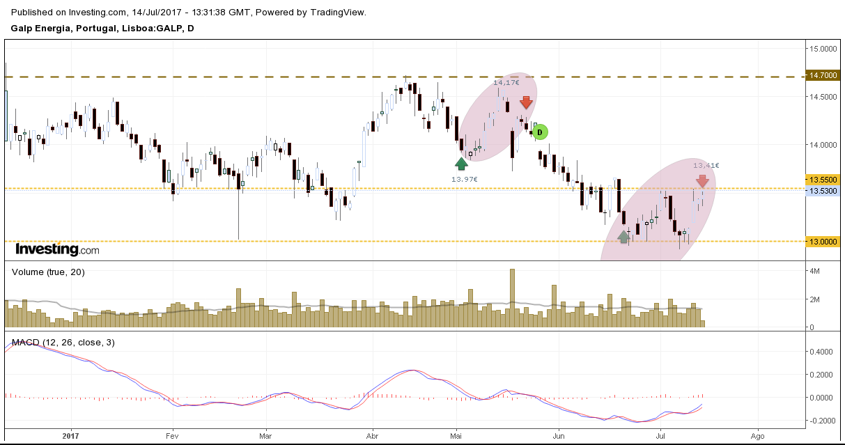 A Galp está aguentar bem o suporte de 13€, perspectivo uma nova subida aos 13,65€.