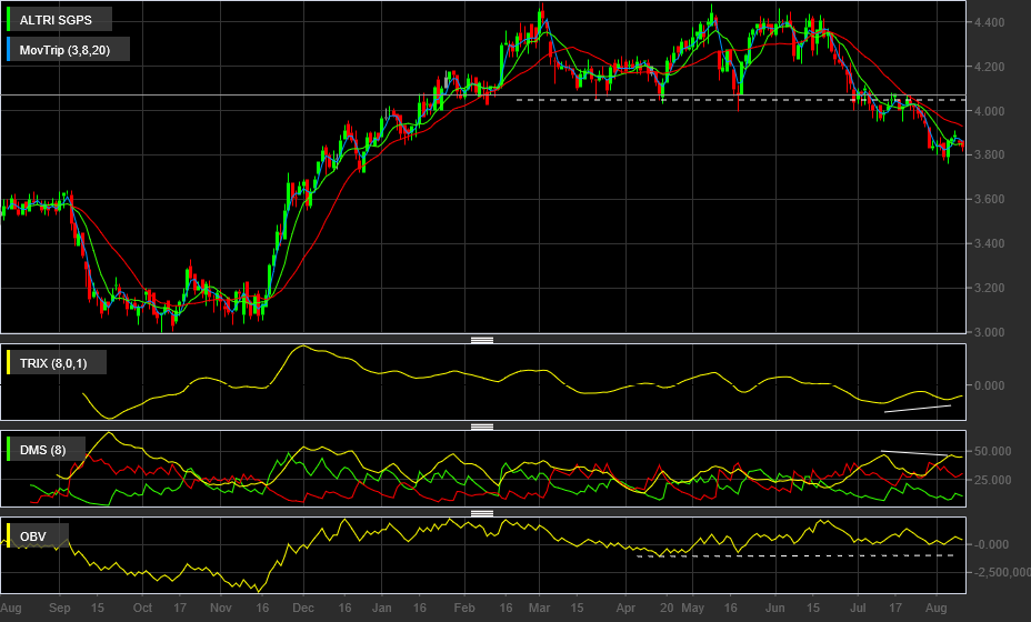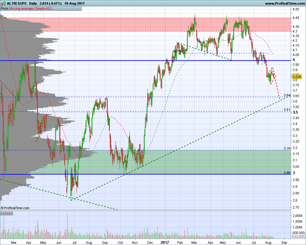 A ALTRI está hoje novamente pela segunda vez a testar os mínimos na zona 3.76, sem evidenciar o mercado vontade compradora neste titulo que vem a cair desde junho, visível no gráfico , parecendo aguardar que o mesmo vá ao primeiro target nos 3.60.