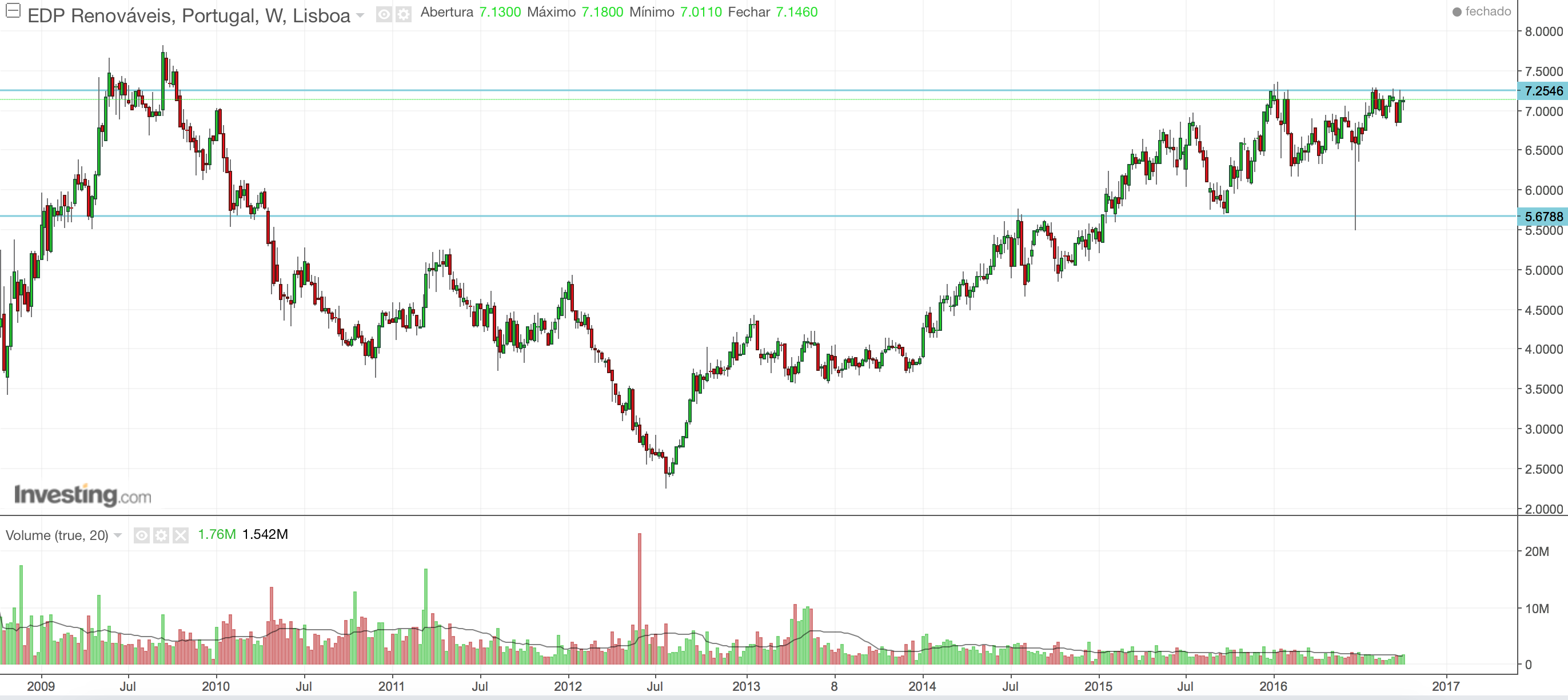 Não sei se será esta próxima semana, ou um pouco mais tarde, mas o certo é que a EDP Renováveis continua o seu maravilhoso Bull Market sem sinais de fraqueza ainda e tudo parece indicar que teremos um disparo para cima brevemente. Se eu quisesse entrar na acção, apesar do optimismo, esperaria então uma quebra em alta dos 7,30€.
