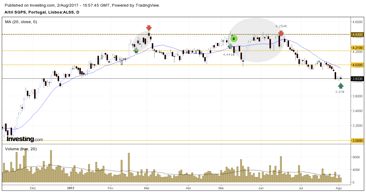 Se vejo suporte ANDAR a testar 4 euros com dificuldades e vejo análise com mas tendências para próximos meses já não entro porque probabilidade e mercado começar refletir expectativas piores e vir muito abaixo do suporte.