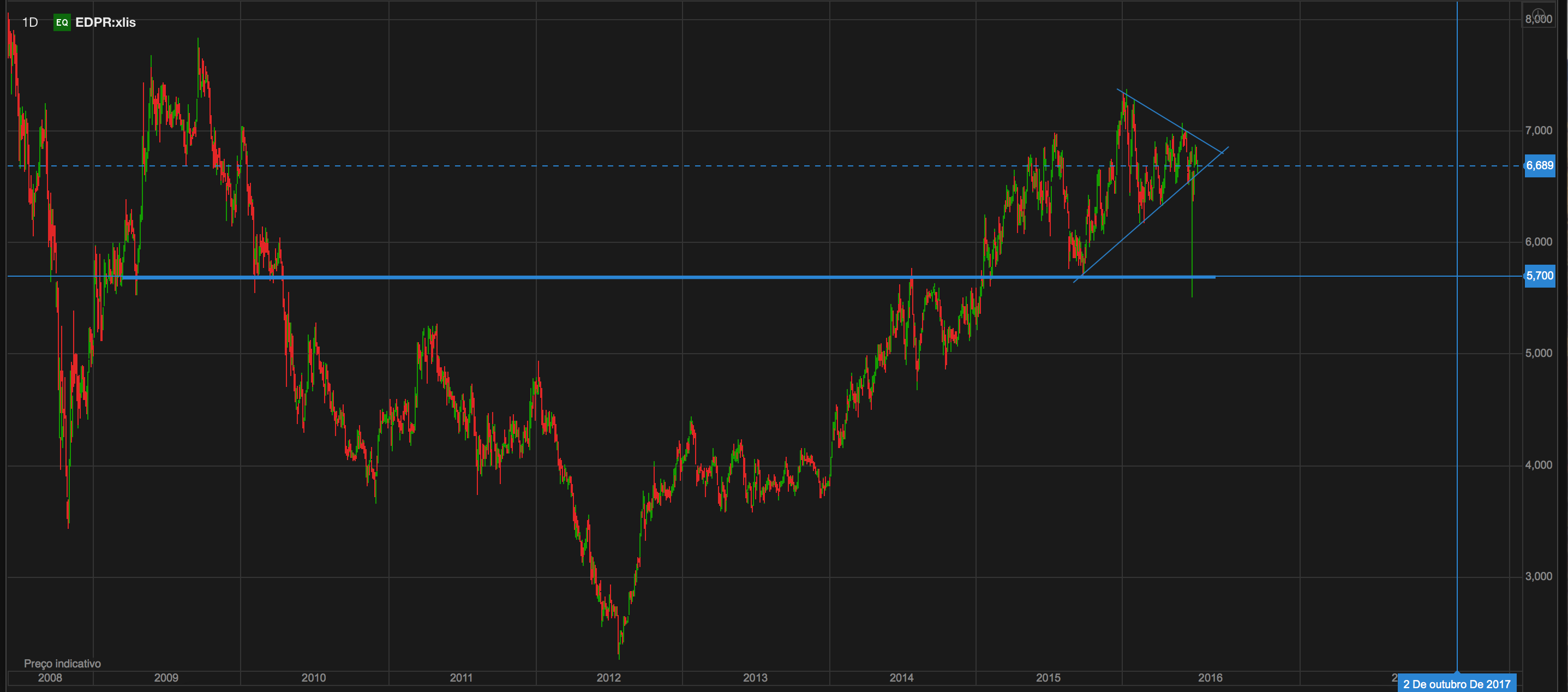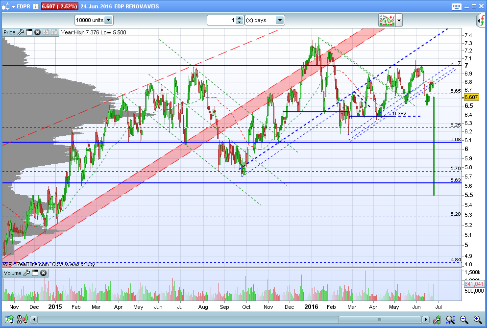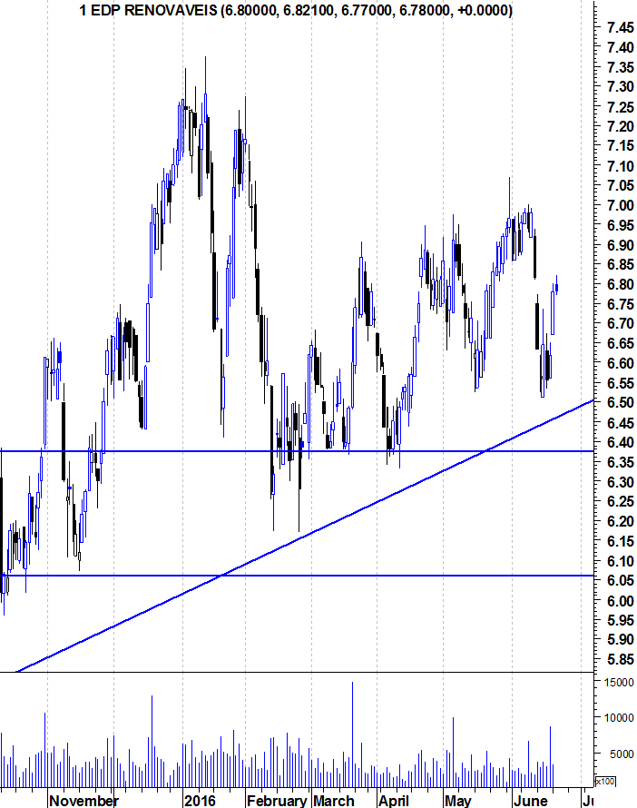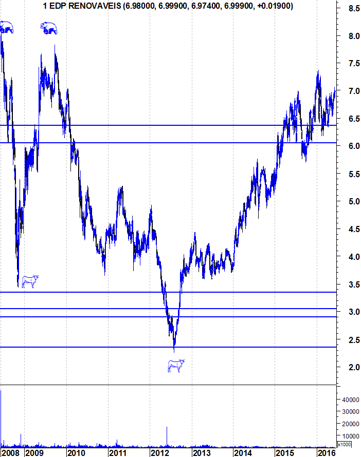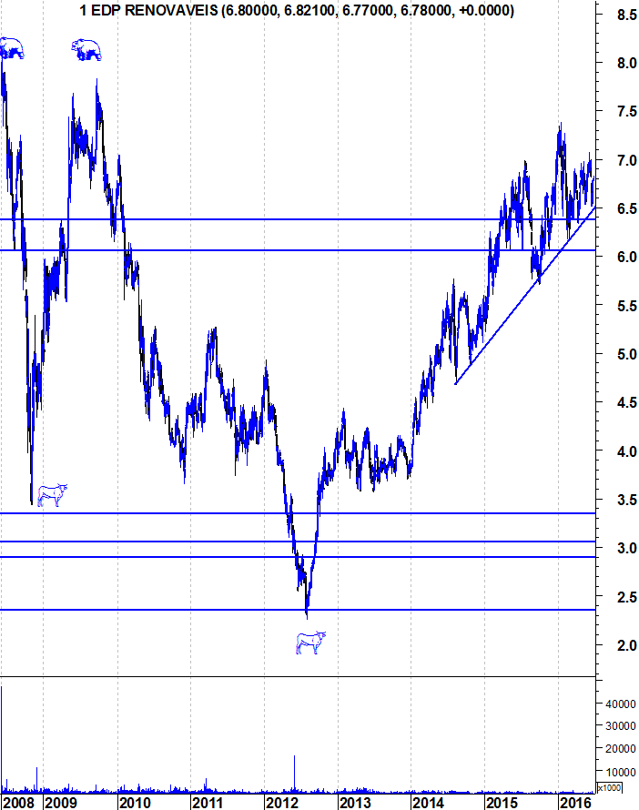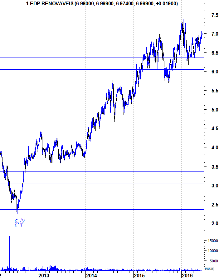 Observando abaixo o gráfico de mais longo prazo, identifico uma linha com história na EDP Renováveis, por volta dos 5,7€. Em 2009 e 2010 serviu de suporte, tendo-se tornado posteriormente resistência em 2014. Ao ser depois ultrapassada, voltou a ser suporte em 2015, e penso que se poderá afirmar que também foi suporte no dia BREXIT (ver longa vela verde).