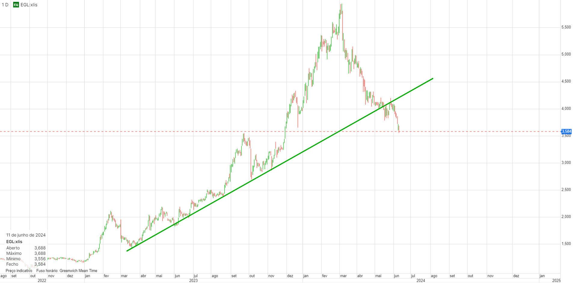 Dito isto, para mim estamos no mesmo ponto onde se inicia a tua LTA, Março de 22, em termos de exaustão de indicadores, etc, mas aqui numa zona historicamente relevante. Se não aguentar, será uma surpresa. Tal como nessa altura esperava que aguentasse a 1,60 e entrou pelos 1,40s (foi uma desvalorização violenta comparável em % e até impacto psicológico, basta ver os comentários aqui na altura…), aqui esperava que aguentasse nos 3,75 e estamos nos 3,50s, mas para já confiante.