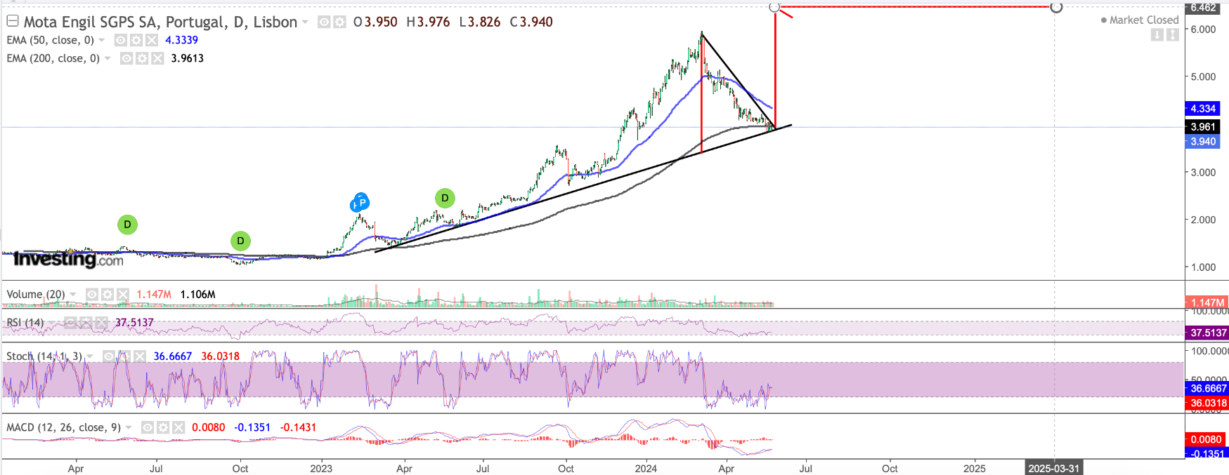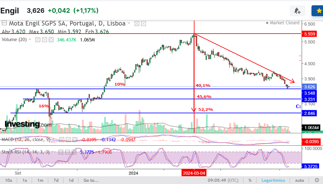 Dito isto, a Mota tem mau aspecto. Vem a cair desde os 6€ (5,94€) e vai quase com 50% de perdas desde os máximos. Quebrou a LT ascendente que trazia desde meados de 2023 e apenas tem suporte relevante na zona dos 3€. Por muito que gostasse que tivesse boas subidas, até porque há muito pessoal aqui que gosta da ação e a tem em carteira, não vejo nada que me leve a acreditar nesse cenário.